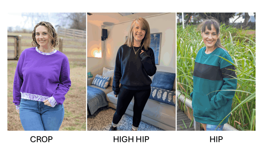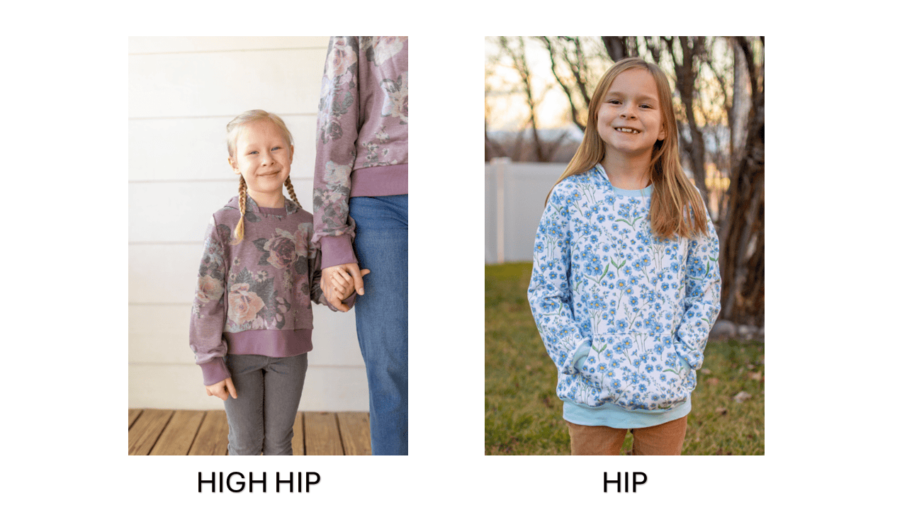 This pattern is packed with options so you can customize the style for every person and every season. Choose from three lengths: a trendy crop, a modern high hip, or a classic hip length. You can finish it with either a snug, traditional waistband or a looser waistband for a more relaxed look. Add a kanga pocket for that classic hoodie feel or keep it clean and simple.