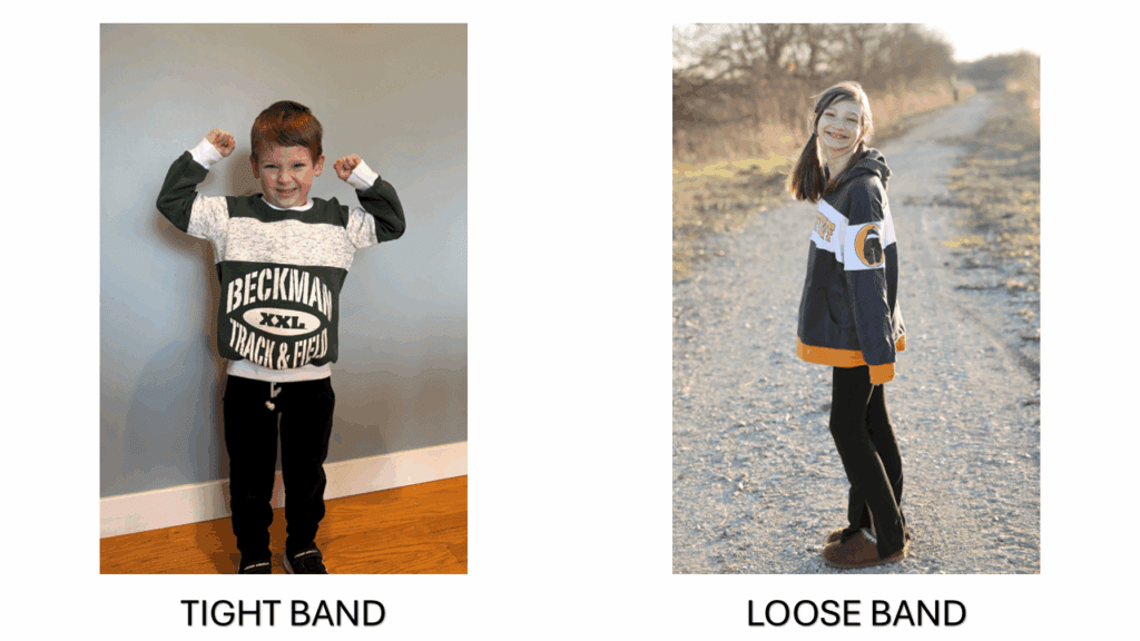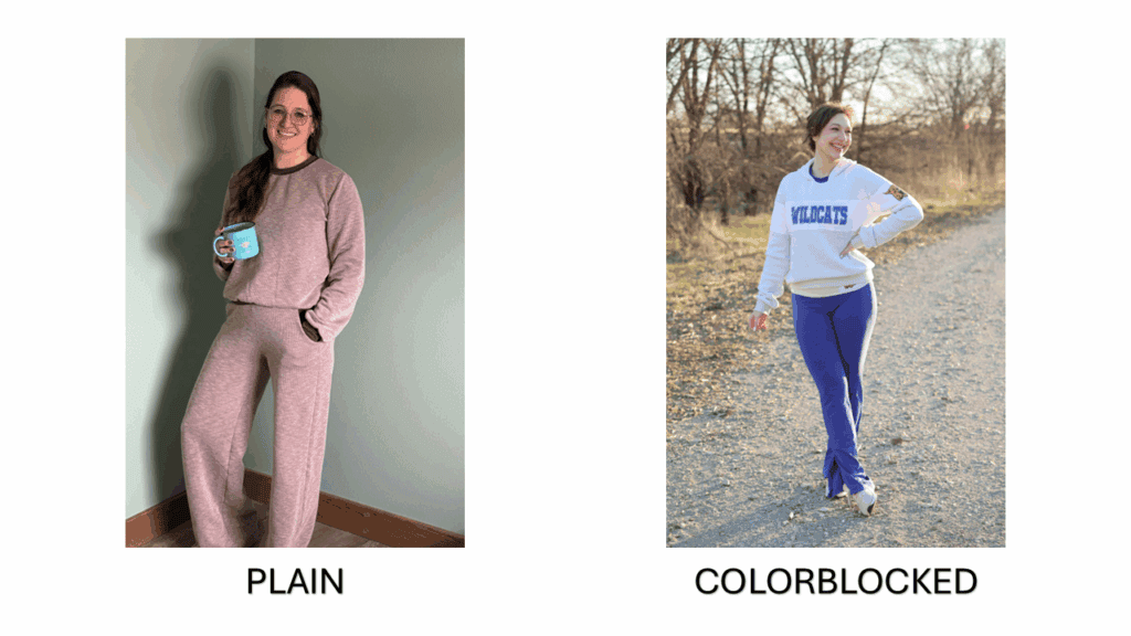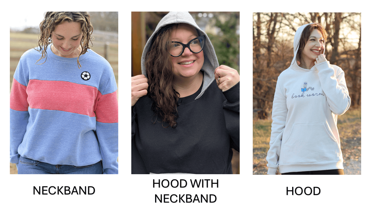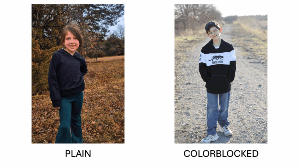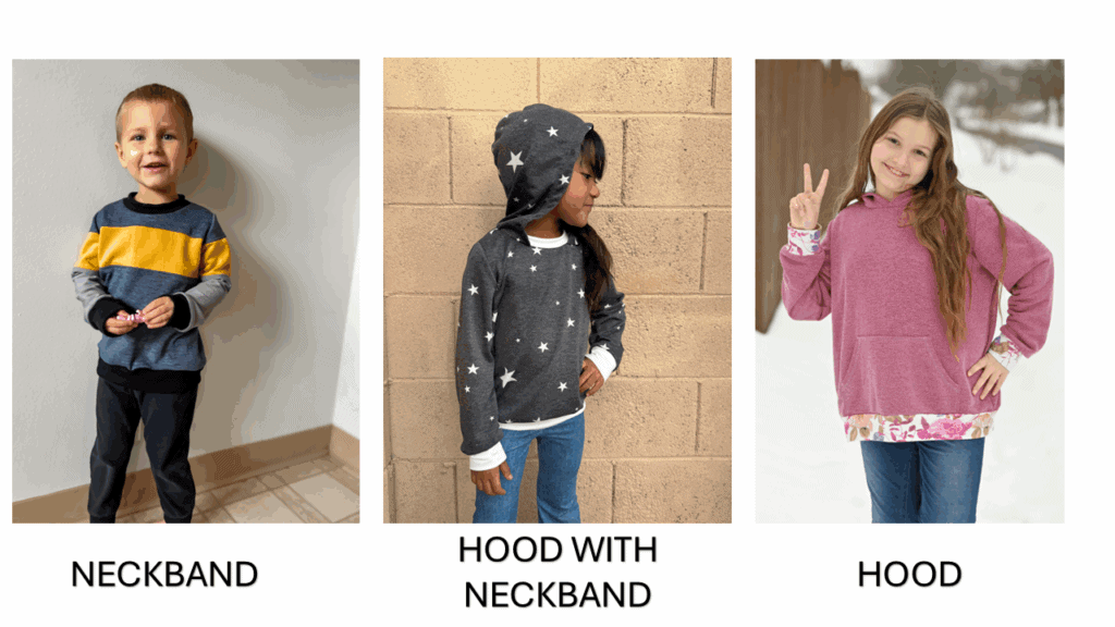 For the neckline, you can sew a standard neckband, a hood, or a hood with a neckband for a fun detail. You can also choose between a plain version or colorblocked body and sleeves, making it perfect for using multiple fabrics, school colors, team spirit wear, or fun scrap-busting combinations.