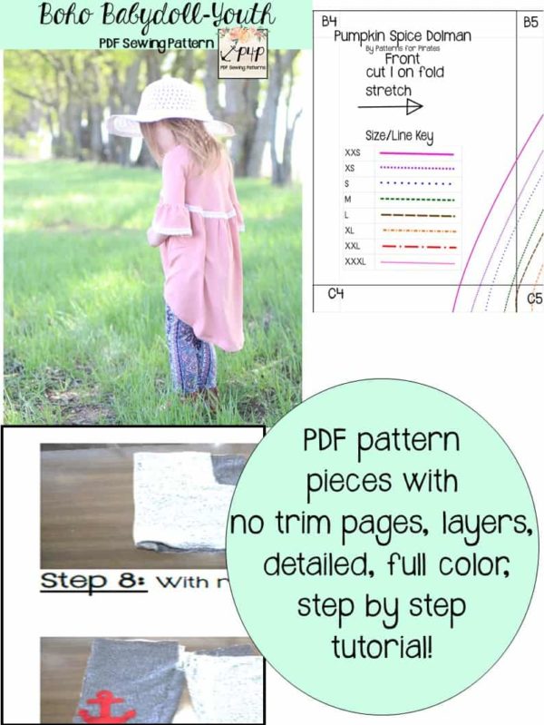 Sizes included: 3m,6m,9m,12m,18m,2,3,4,5,6,7,8,10,12,14. Size chart is on last listing picture. You will receive the easy to print and match color coded pattern pieces on NO TRIMMING pages with LAYERS options at printing in both US Letter, A4, Copy Shop, and Projector Files! A cutting guide for rectangle pieces, and a full color and detailed picture step by step tutorial and guide to making the garment.