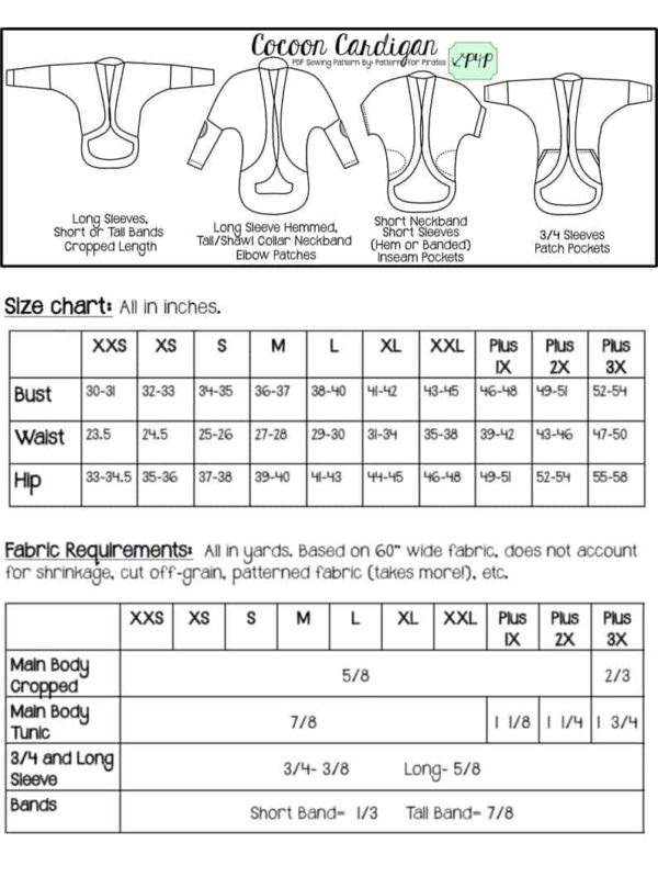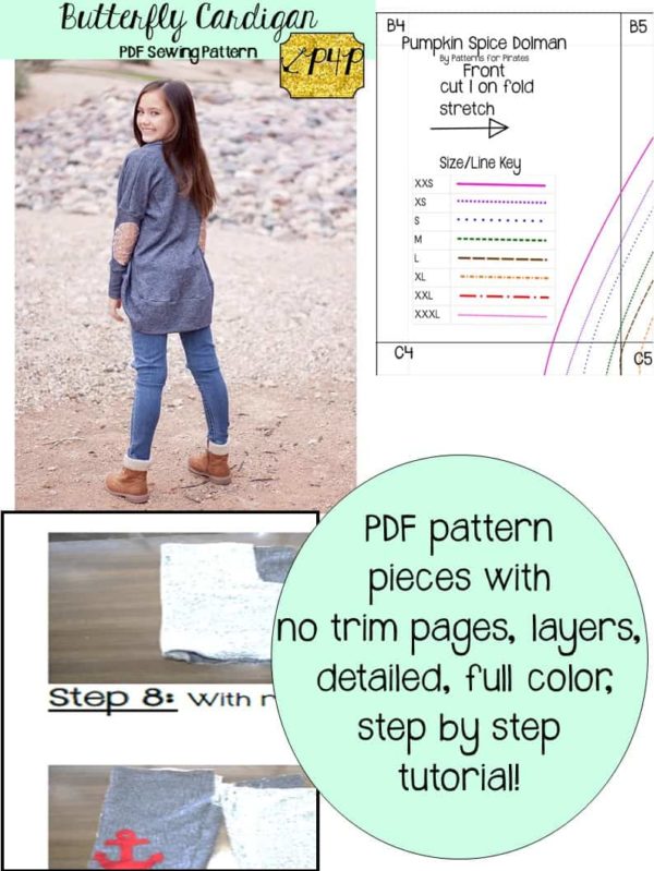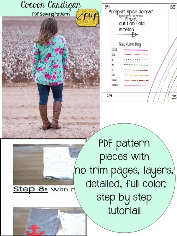You will receive the easy to print and match color coded pattern pieces on NO TRIM PAGES and have LAYERS so you can print only the size you need. In US letter, A4, A0 Copy Shop, and Projector file sizes. A cutting guide for rectangle pieces, and a full color and detailed picture step by step tutorial and guide to making the garment.