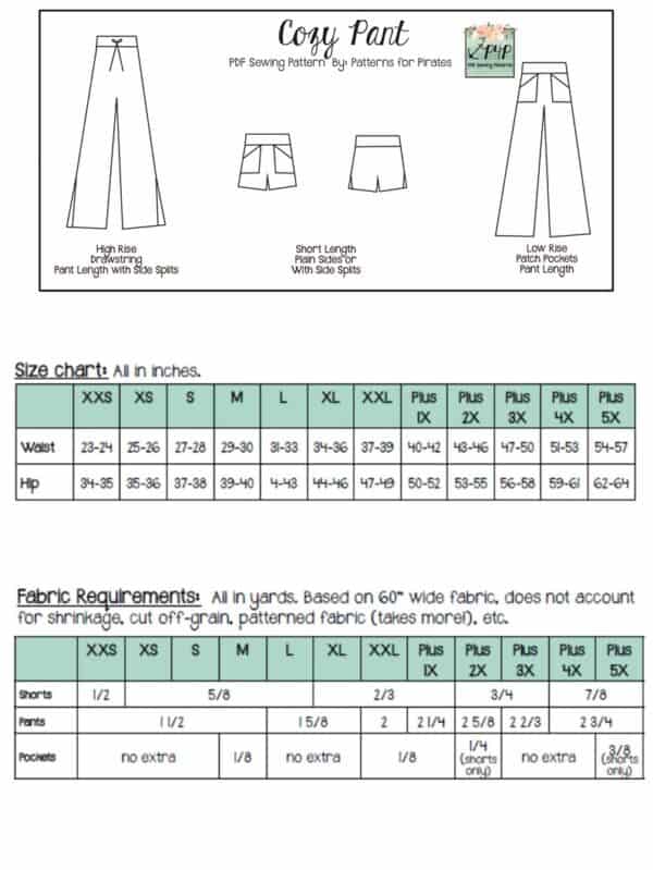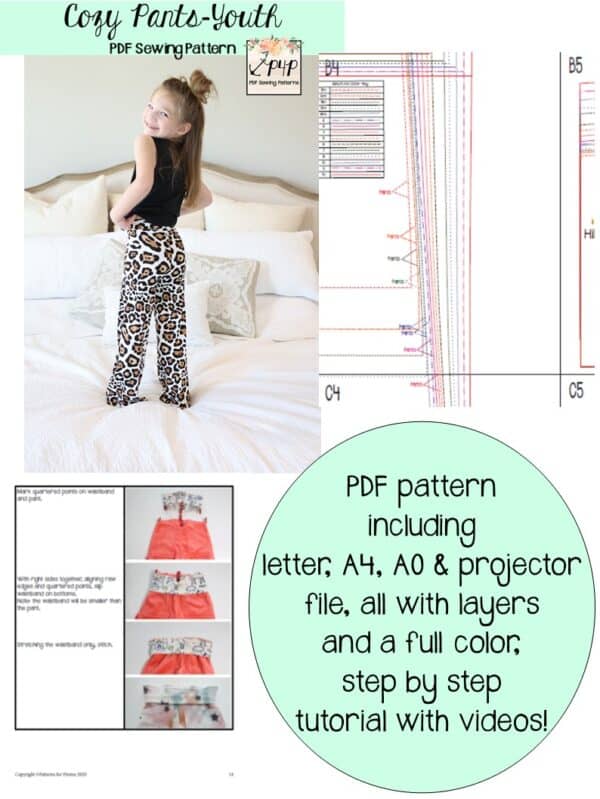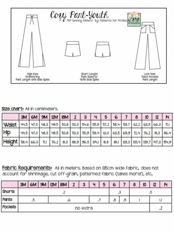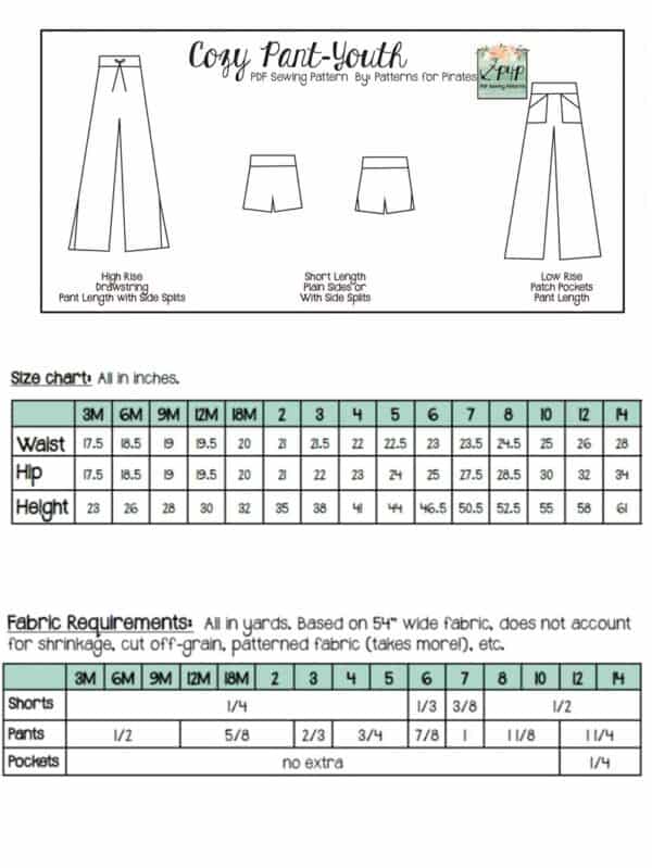 Youth Sizes included: 3m,6m,9m,12m,18m,2,3,4,5,6,7,8,10,12,14 (sizing/measurement chart on last picture). Youth pattern available alone here: Cozy Pants-Youth