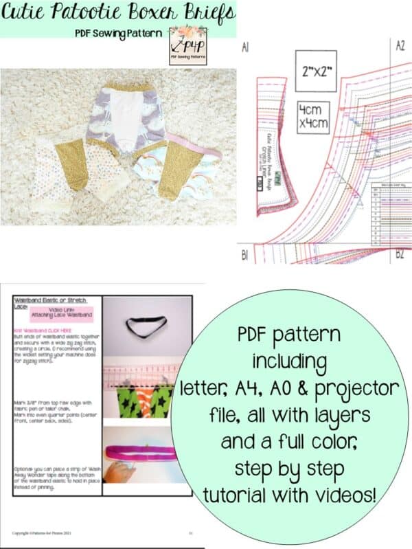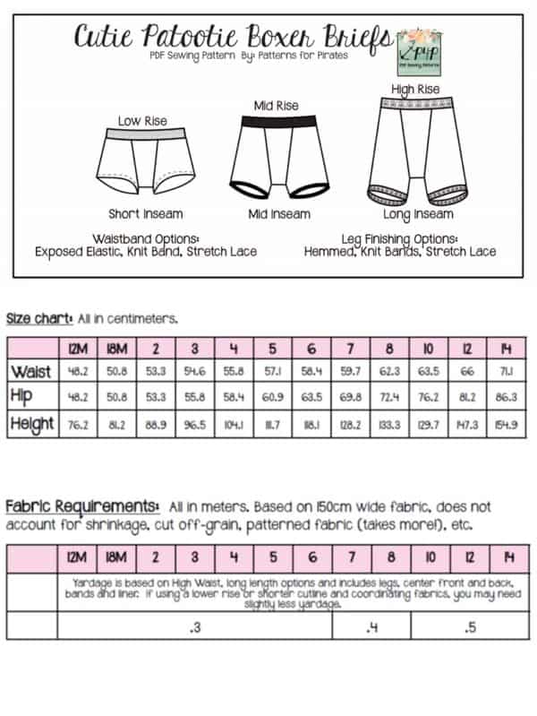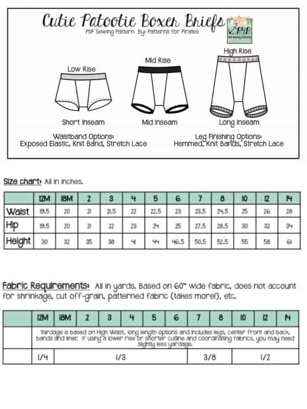 Youth Sizes included: 12m,18m,2,3,4,5,6,7,8,10,12,14 (sizing/measurement chart on last picture). Youth pattern available alone here: Cutie Patootie Boxer Briefs