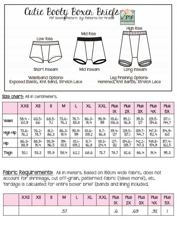 You can choose from so many different options, you’re sure to find a favorite, perfect combo for yourself or anyone else you’re sewing them up for. There is a low, mid and high rise hitting at hip bones, at perferred waist, and up to the belly button. Use exposed elastic for a super classic look and feel, or go for a knit band or stretch lace for the waistbands for something a little different. The legs can be hemmed, have knit bands or stretch lace on the three different lengths: short, mid, and long.