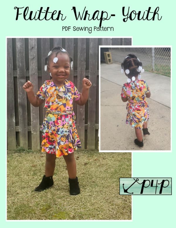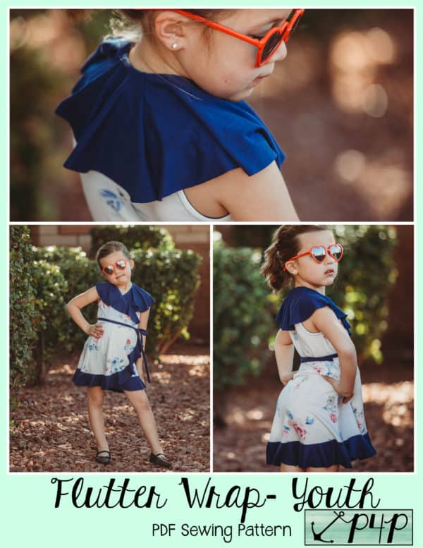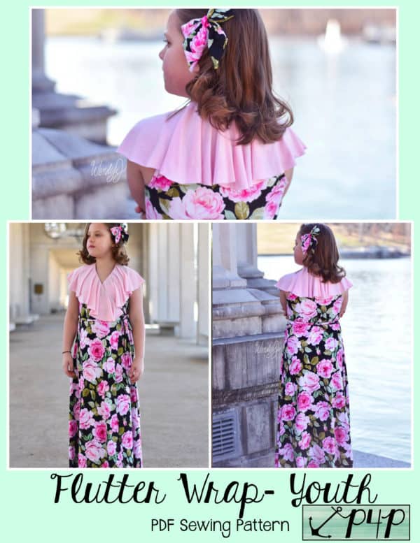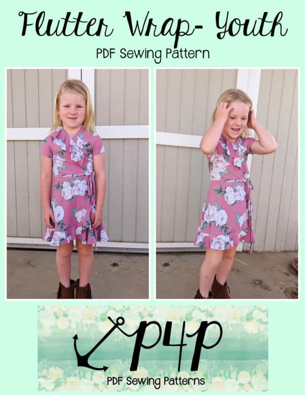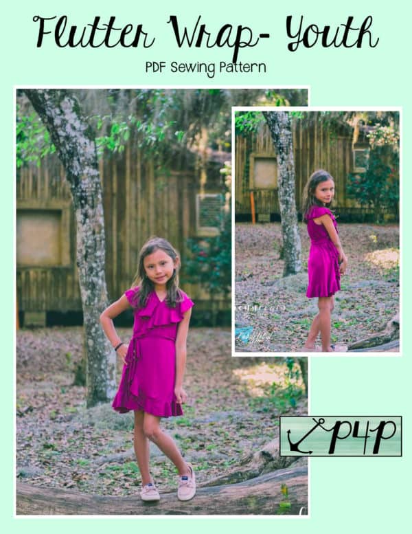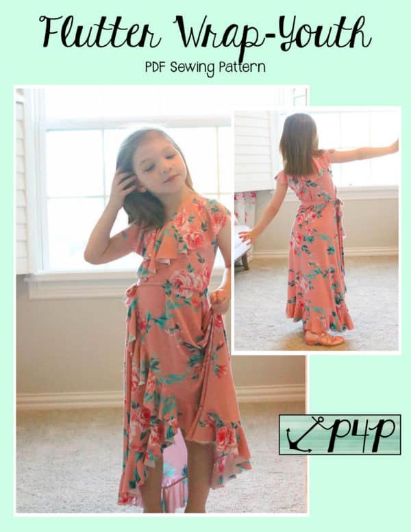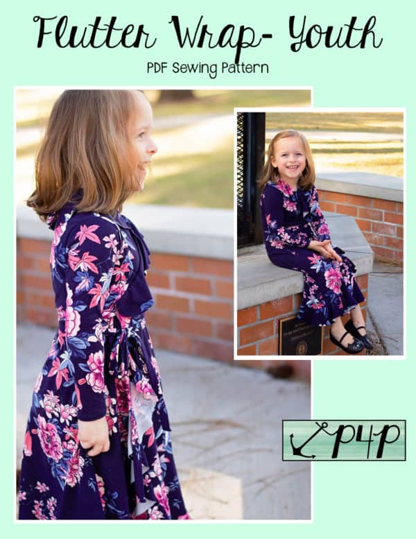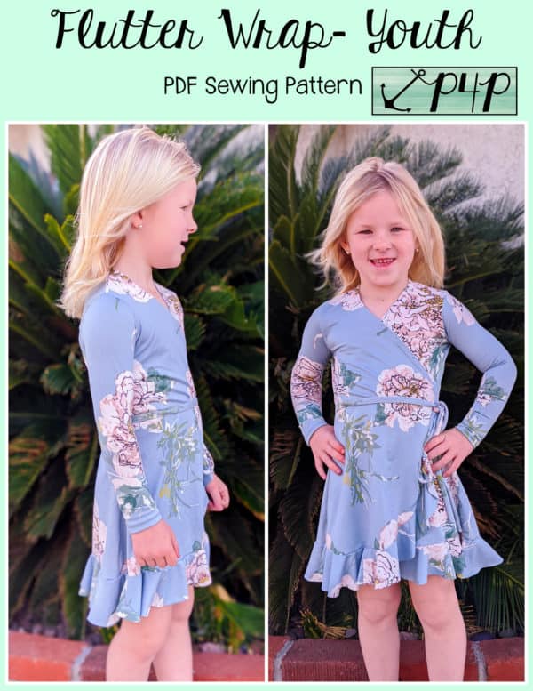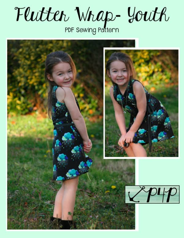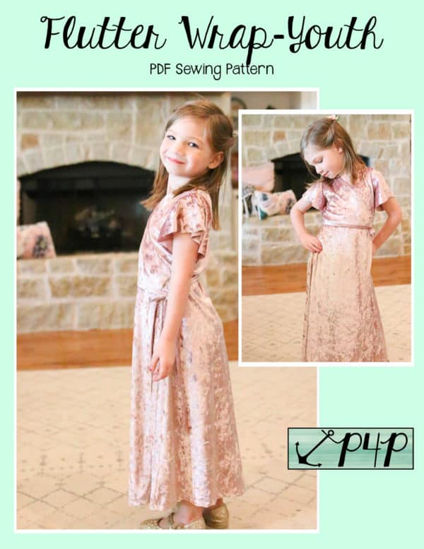 The Flutter Wrap can be an everyday top and dress or a show stopper formal depending on options you pick! It works great for any special occasion! The flounce and flutter sleeve options give it such a fun detail that any little one would love to twirl around with! It has a wide variety of fabrics you can use for the different options. It is drafted for knit stretch fabrics with at least 30% horizontal stretch. Flounce options work great with fabrics with a soft drape to create those beautiful cascading ruffle look with no gathering! Whoever you’re sewing the Flutter Wrap for they will surely feel glamorous! The wrap style allows for easy fitting with tying it a bit tighter to looser as they grow!