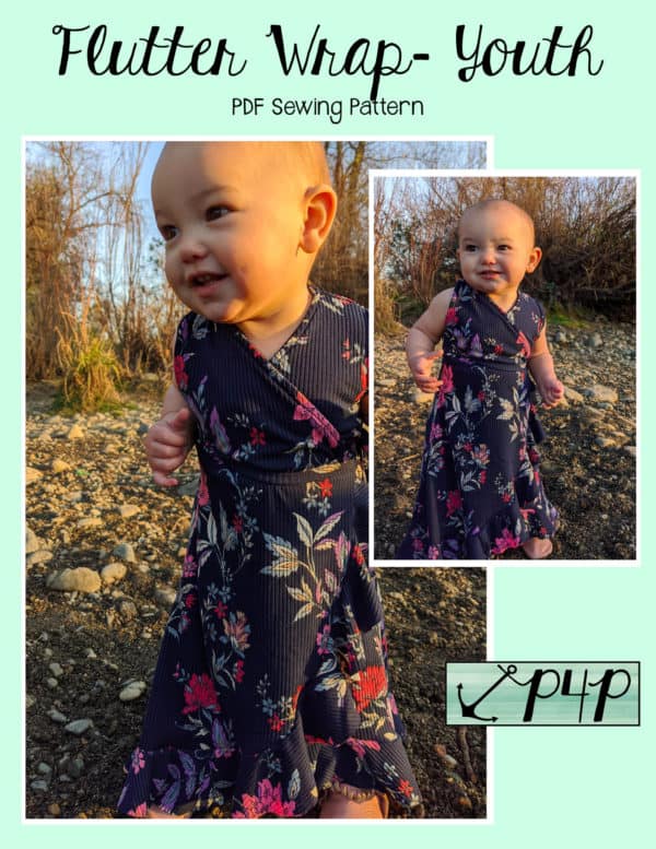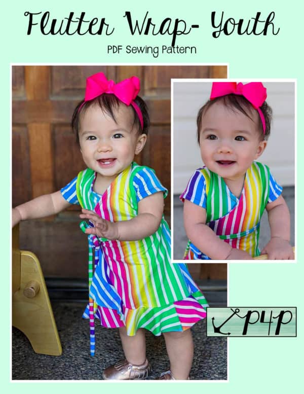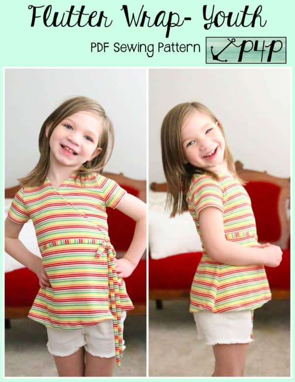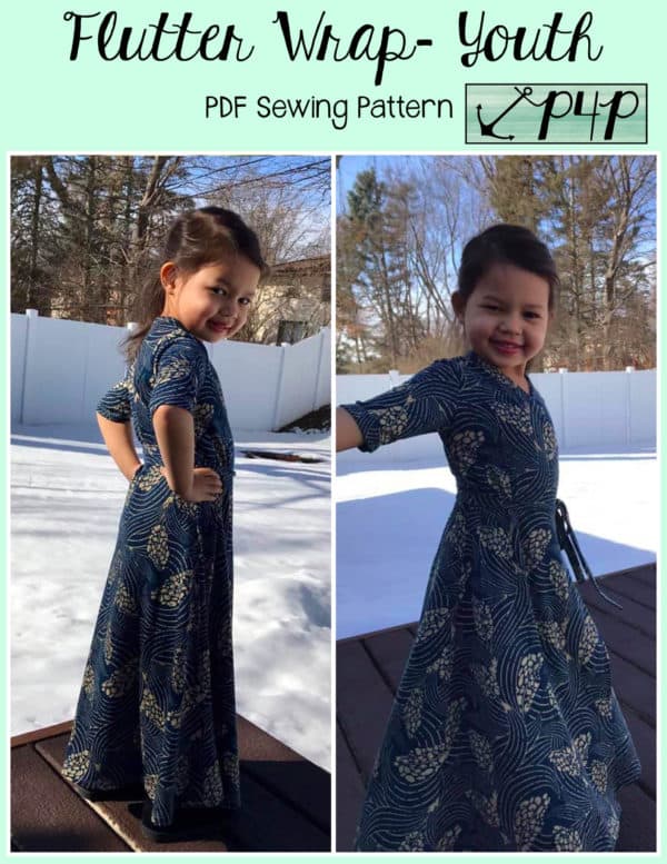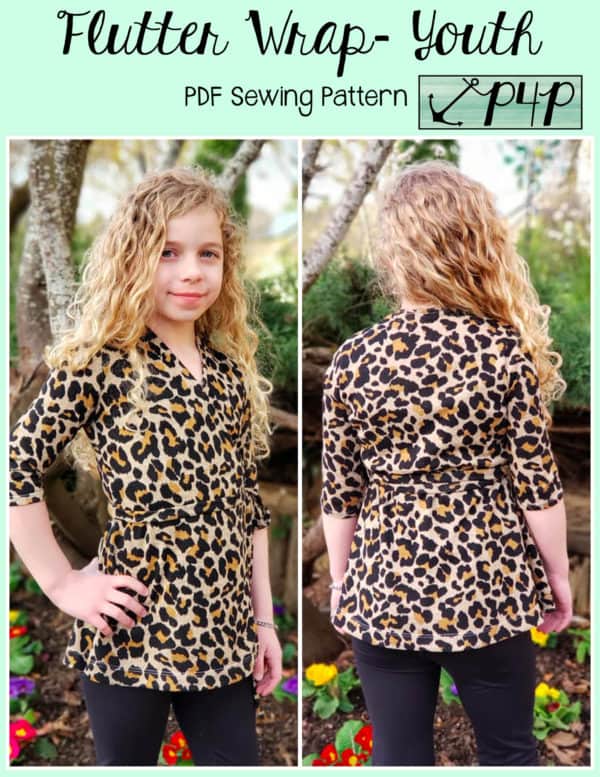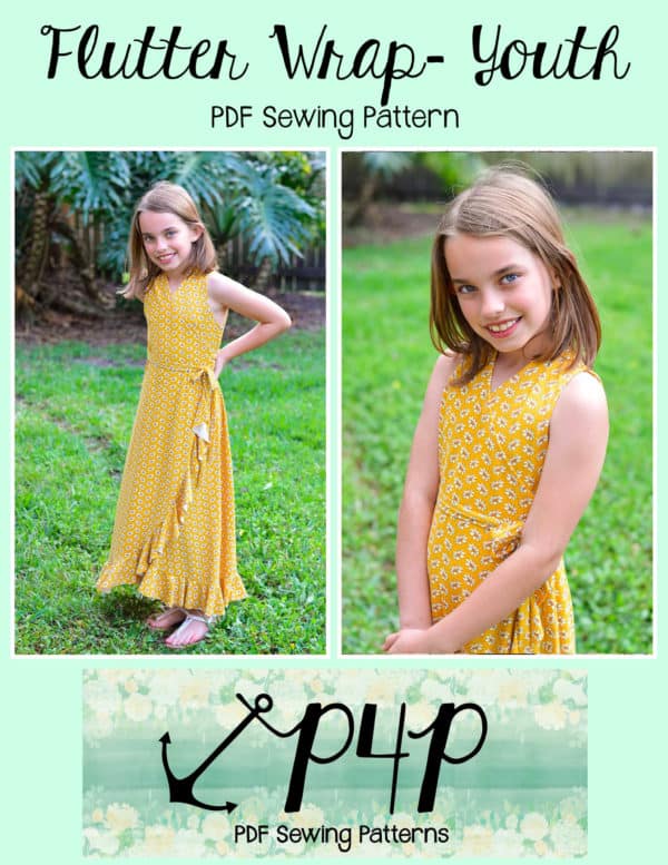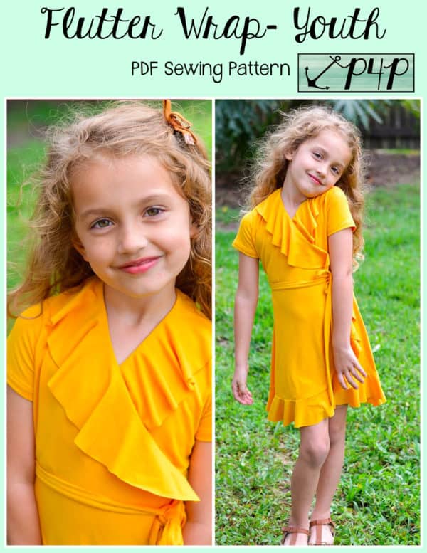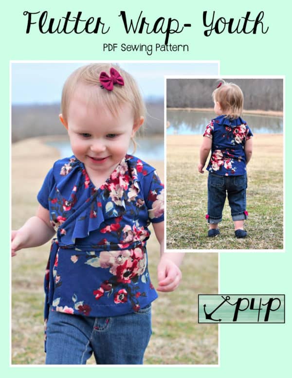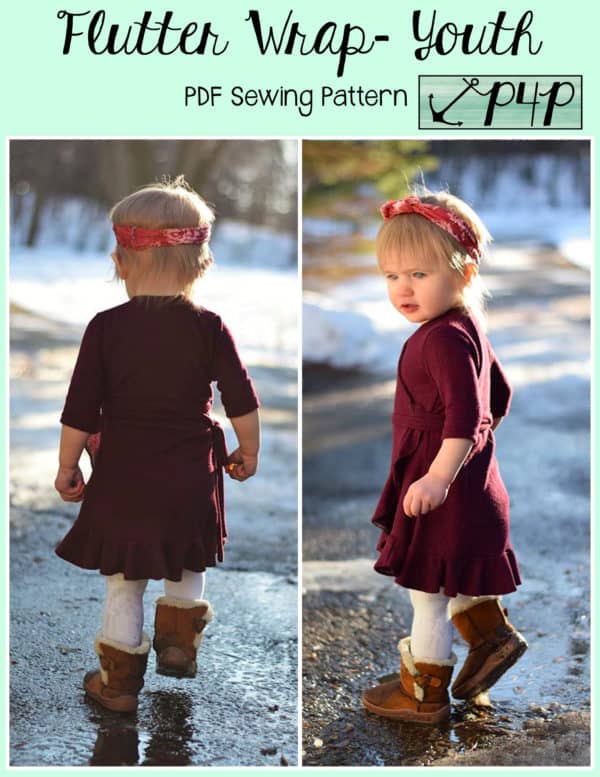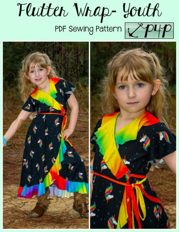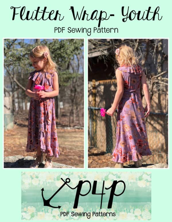 The Flutter Wrap can be an everyday top and dress or a show stopper formal depending on options you pick! It works great for any special occasion! The flounce and flutter sleeve options give it such a fun detail that any little one would love to twirl around with! It has a wide variety of fabrics you can use for the different options. It is drafted for knit stretch fabrics with at least 30% horizontal stretch. Flounce options work great with fabrics with a soft drape to create those beautiful cascading ruffle look with no gathering! Whoever you’re sewing the Flutter Wrap for they will surely feel glamorous! The wrap style allows for easy fitting with tying it a bit tighter to looser as they grow!