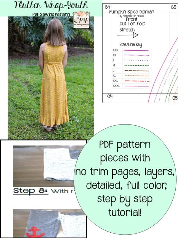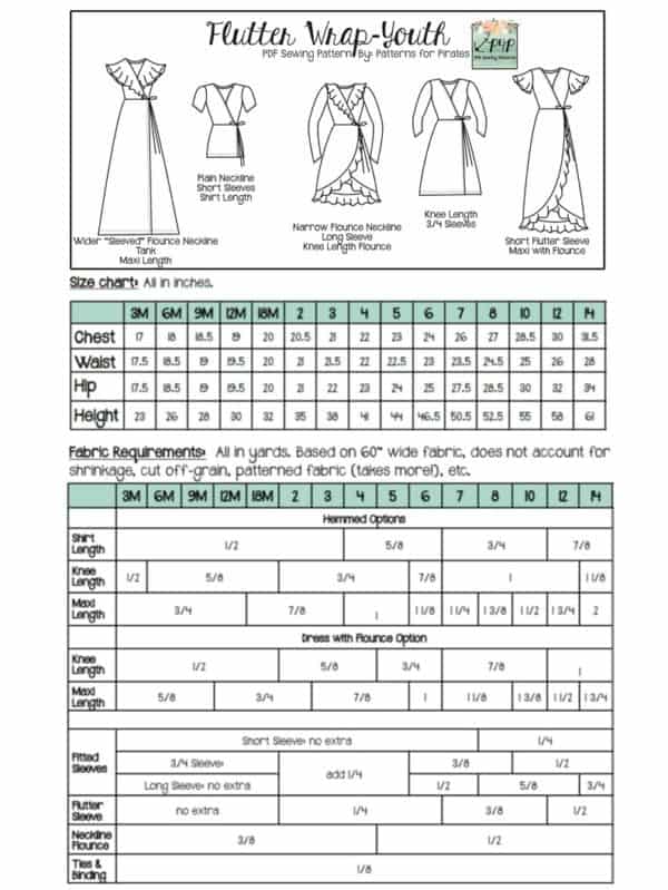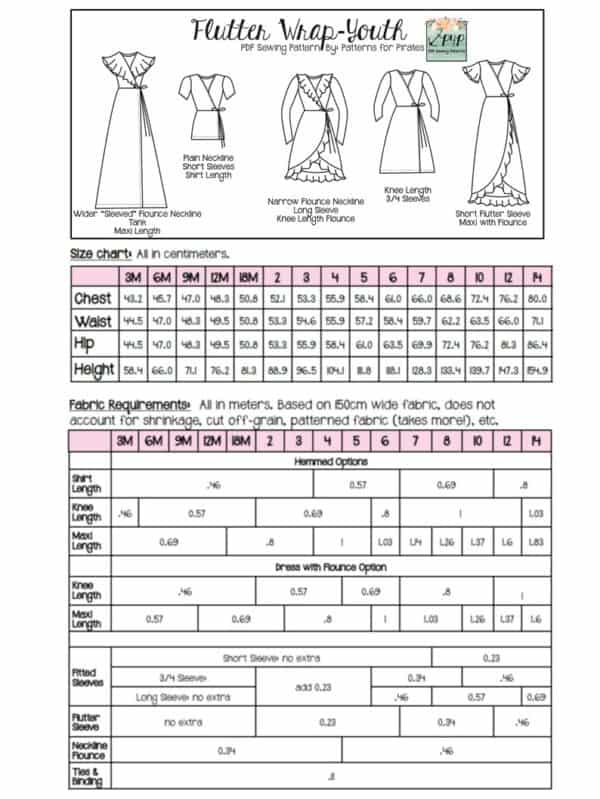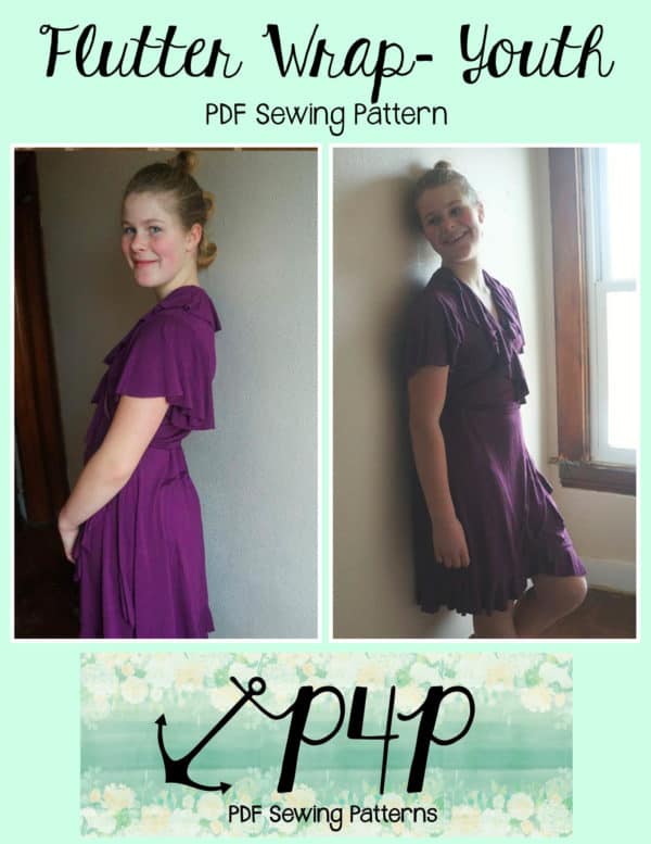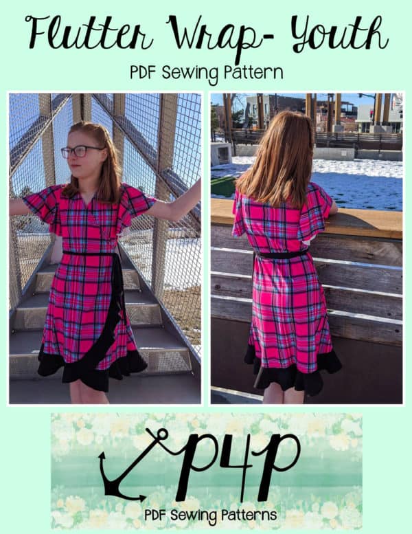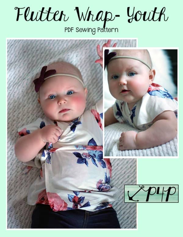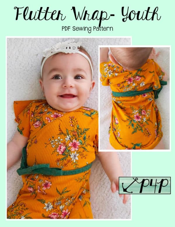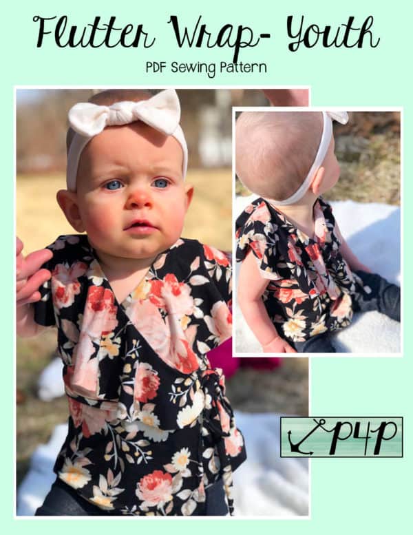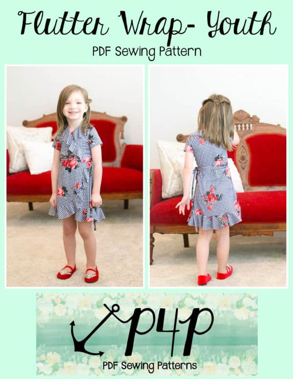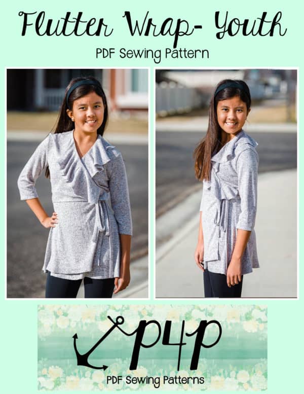 The Flutter Wrap can be an everyday top and dress or a show stopper formal depending on options you pick! It works great for any special occasion! The flounce and flutter sleeve options give it such a fun detail that any little one would love to twirl around with! It has a wide variety of fabrics you can use for the different options. It is drafted for knit stretch fabrics with at least 30% horizontal stretch. Flounce options work great with fabrics with a soft drape to create those beautiful cascading ruffle look with no gathering! Whoever you’re sewing the Flutter Wrap for they will surely feel glamorous! The wrap style allows for easy fitting with tying it a bit tighter to looser as they grow!