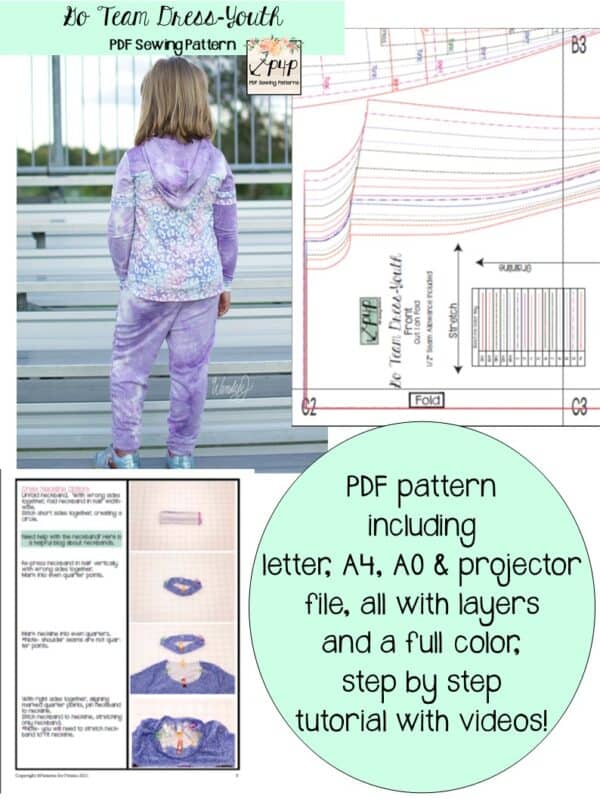 Youth Sizes included: 3m,6m,9m,12m,18m,2,3,4,5,6,7,8,10,12,14 (sizing/measurement chart in picture). Youth pattern available alone here: Go Team Dress- Youth and Go Team Jersey-Youth
