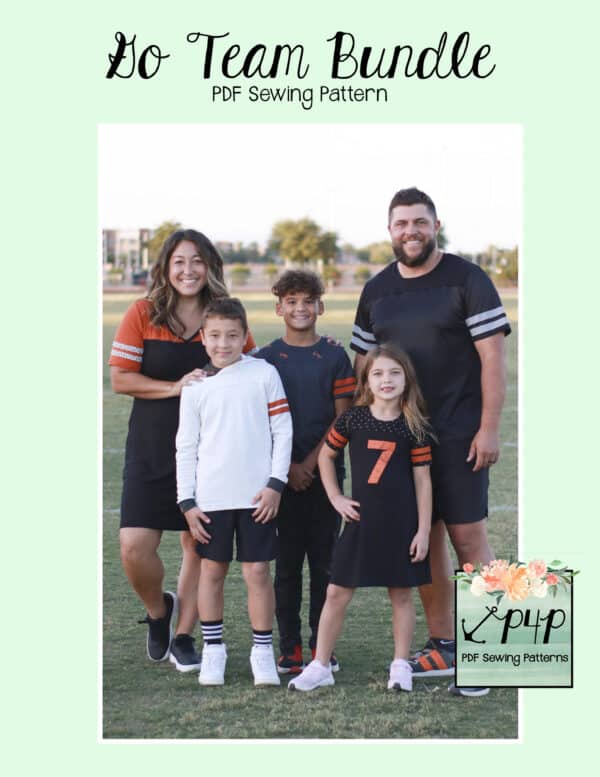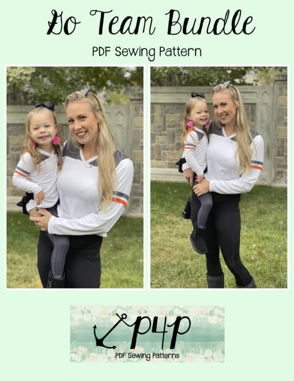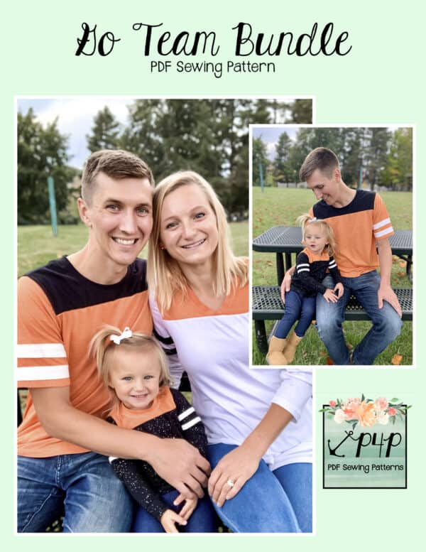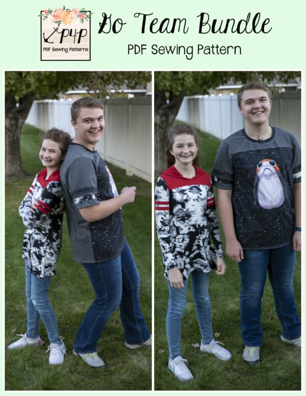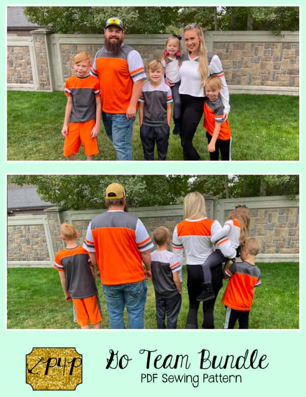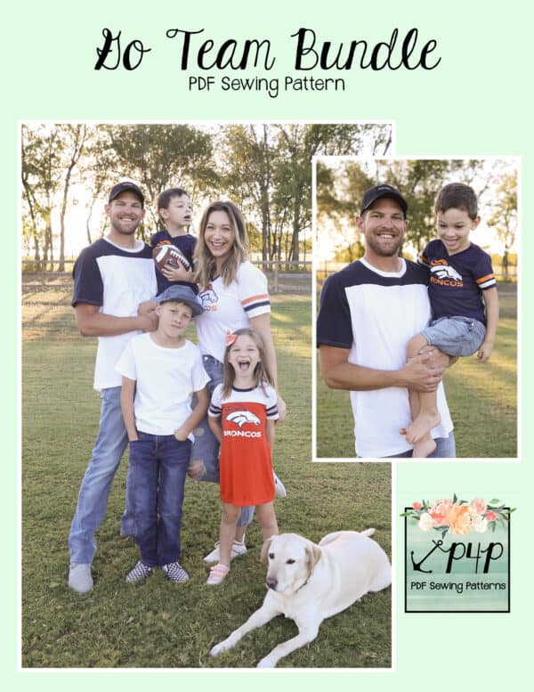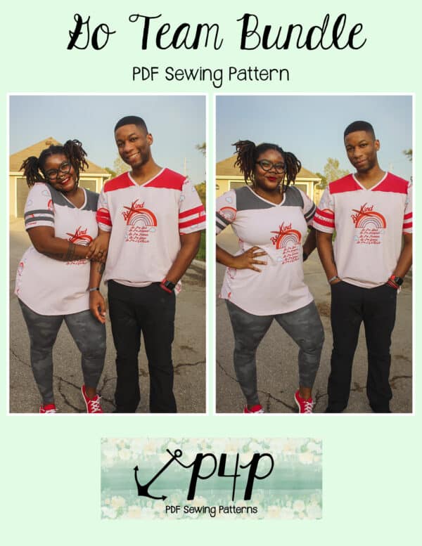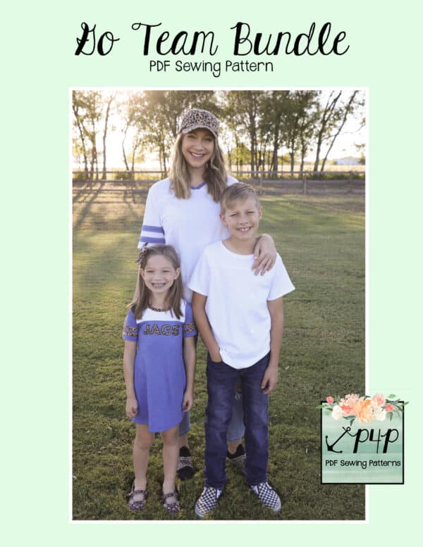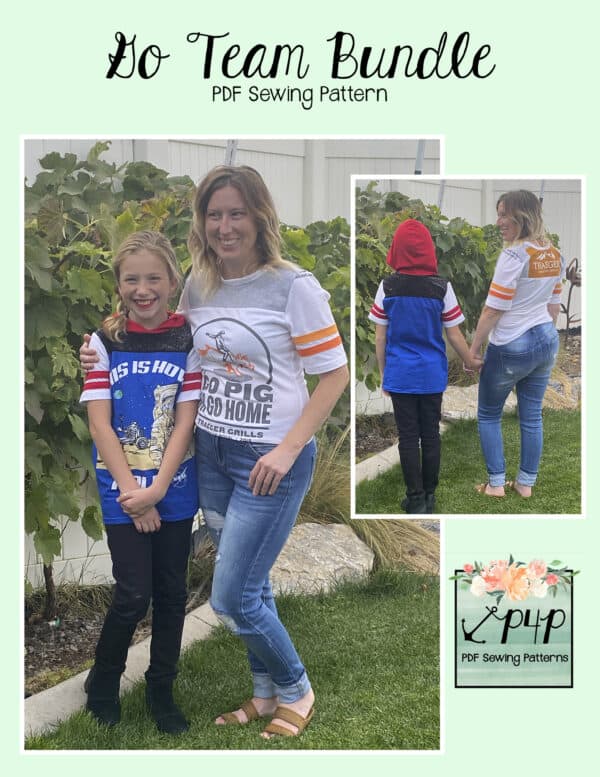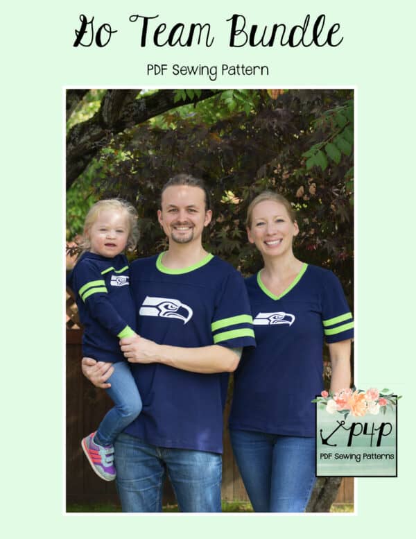 The Go Team Bundle gives everyone a way to cheer on their favorite team whether it’s a football team, holiday/special occasion, or just your favorite treat you’d like to show your love for. All the Go Team patterns include short, 3/4 and long sleeves so you can make a tee to fit any time of year. You can pick from a crew neckline, V neckline or a hood. The V neckline is an easy overlapped V. The optional sleeve stripes, front and back yokes give it that jersey/sporty feel.
