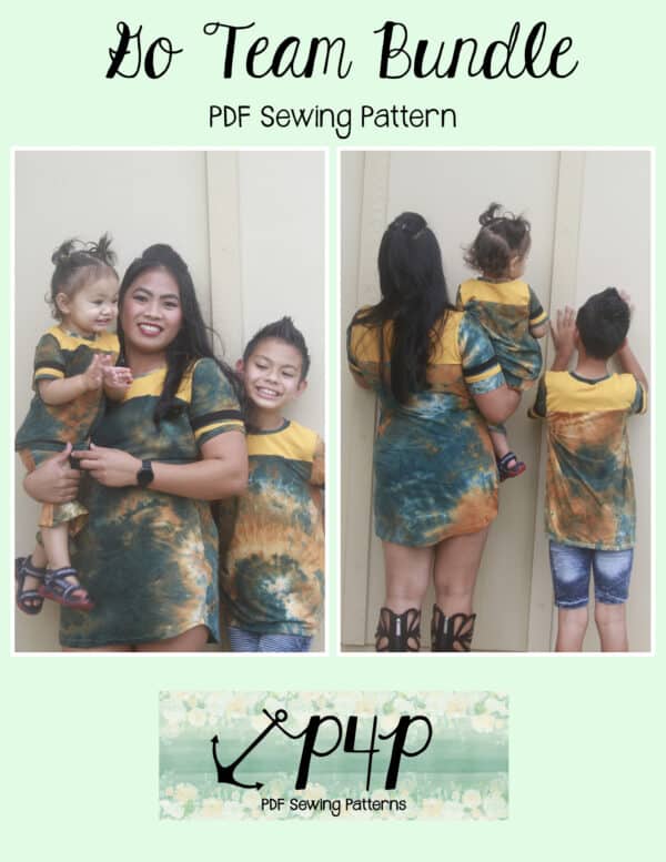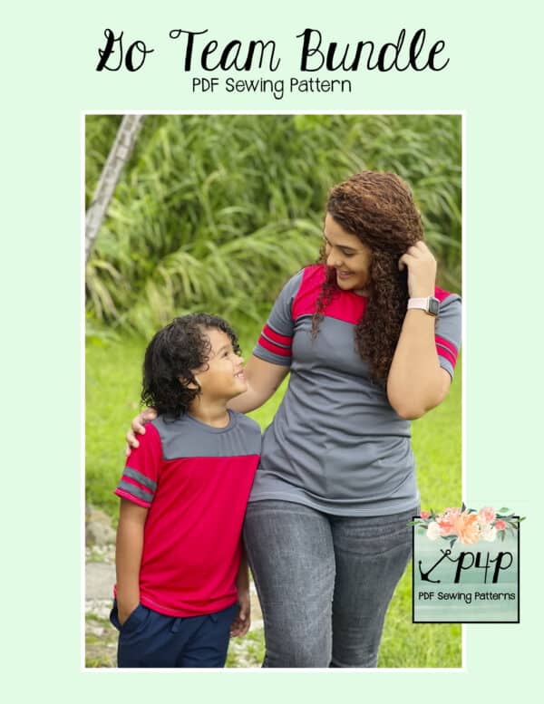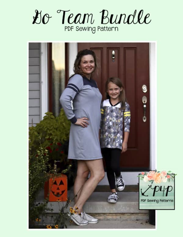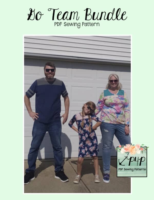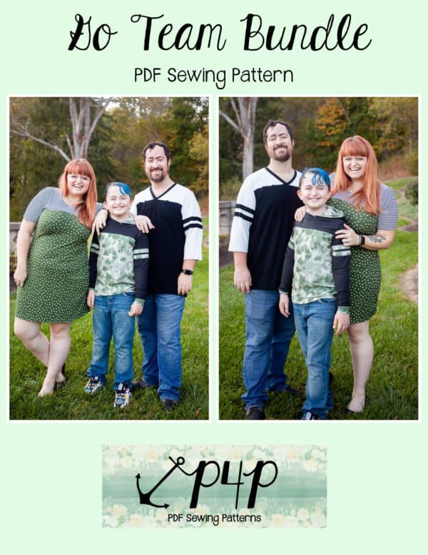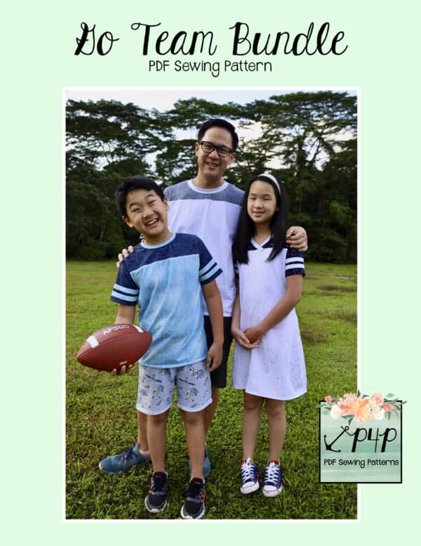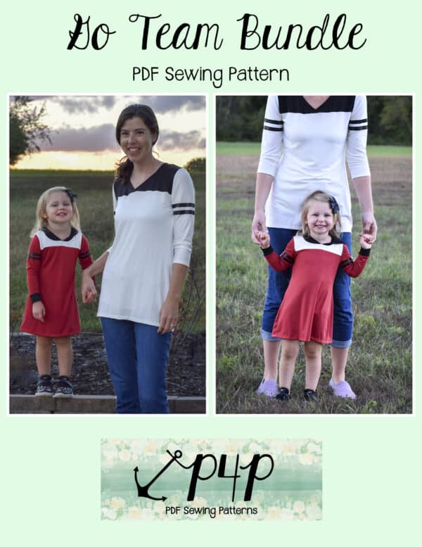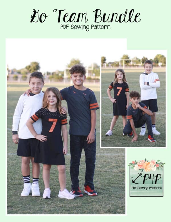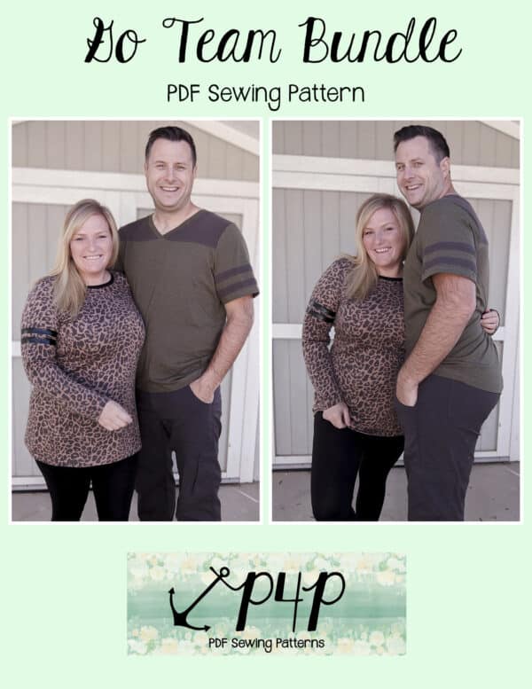 The Go Team Bundle gives everyone a way to cheer on their favorite team whether it’s a football team, holiday/special occasion, or just your favorite treat you’d like to show your love for. All the Go Team patterns include short, 3/4 and long sleeves so you can make a tee to fit any time of year. You can pick from a crew neckline, V neckline or a hood. The V neckline is an easy overlapped V. The optional sleeve stripes, front and back yokes give it that jersey/sporty feel.