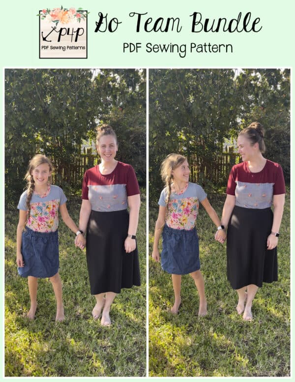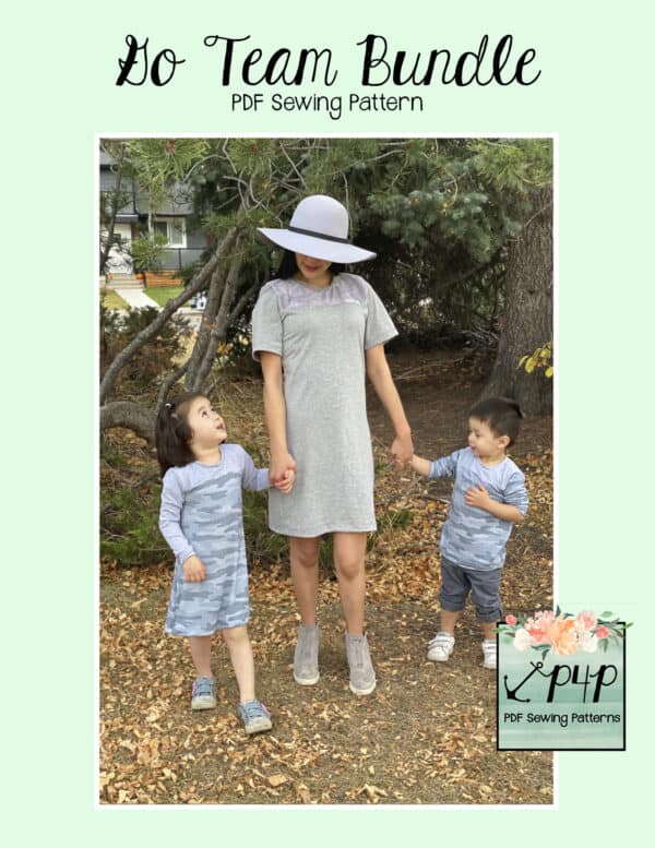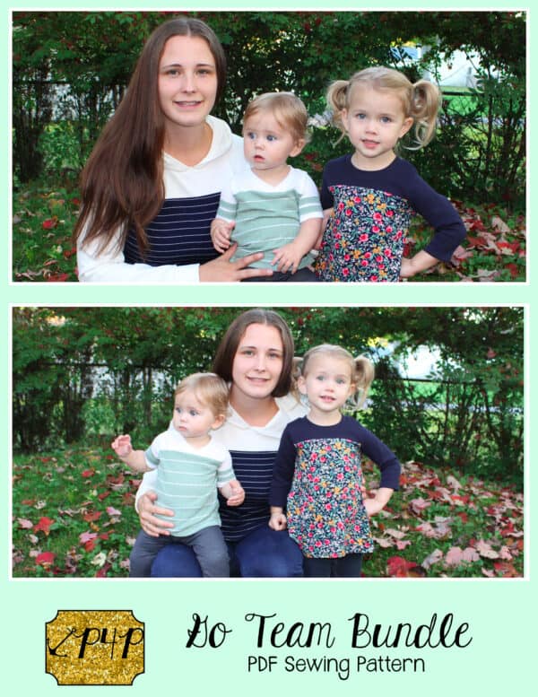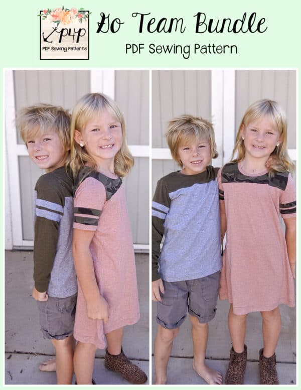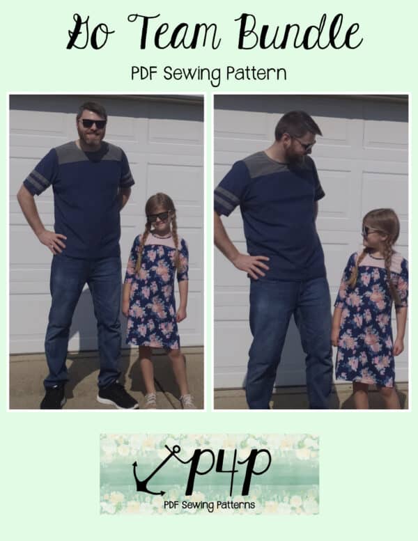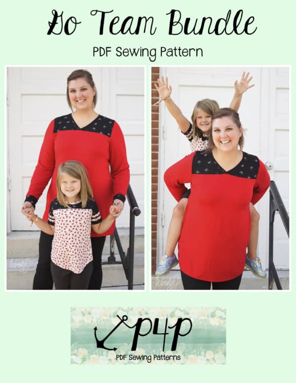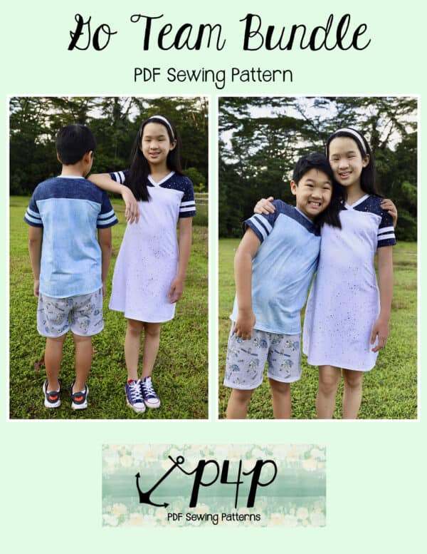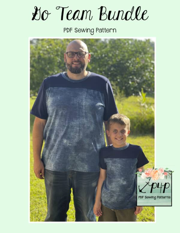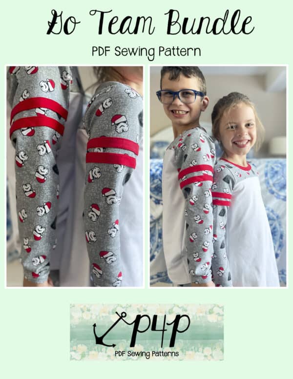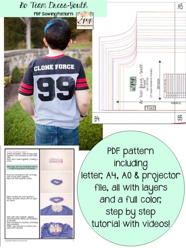The Go Team Bundle gives everyone a way to cheer on their favorite team whether it’s a football team, holiday/special occasion, or just your favorite treat you’d like to show your love for. All the Go Team patterns include short, 3/4 and long sleeves so you can make a tee to fit any time of year. You can pick from a crew neckline, V neckline or a hood. The V neckline is an easy overlapped V. The optional sleeve stripes, front and back yokes give it that jersey/sporty feel.