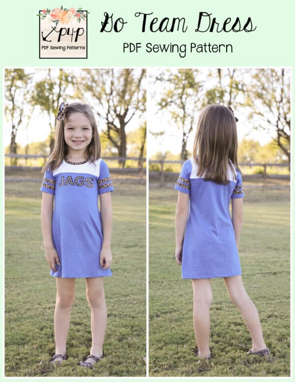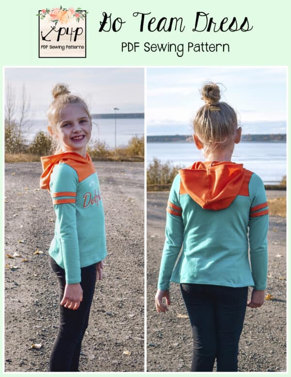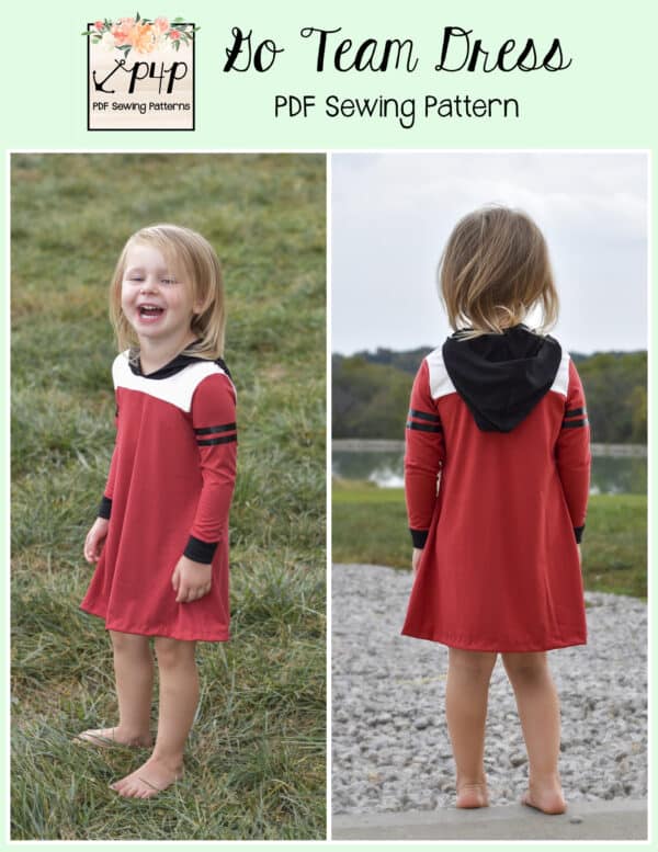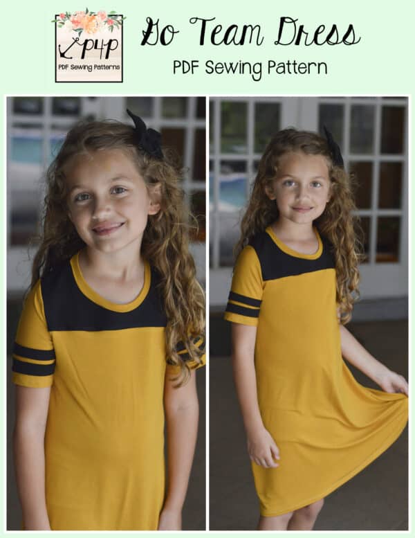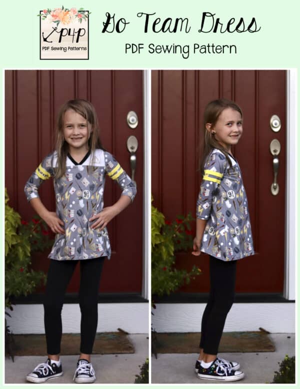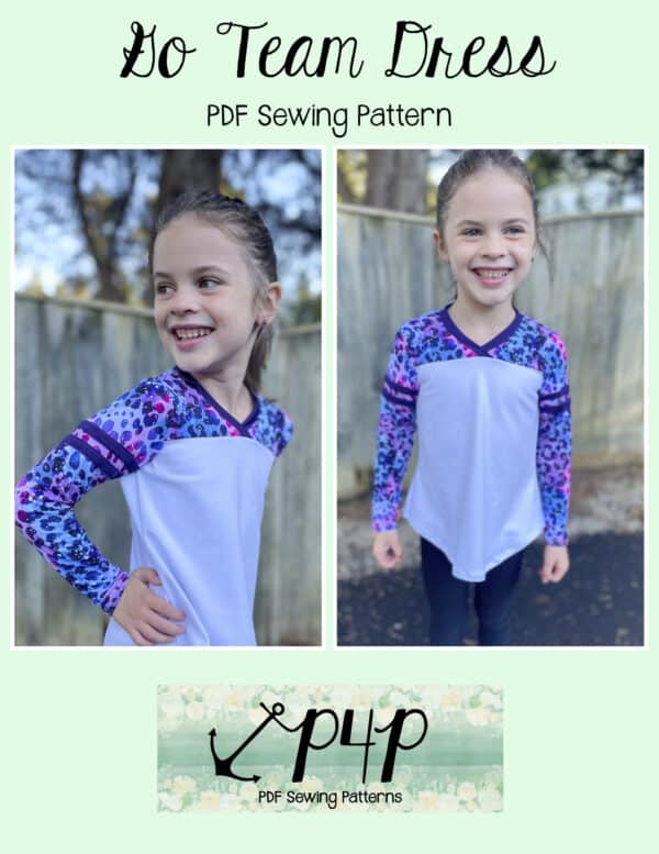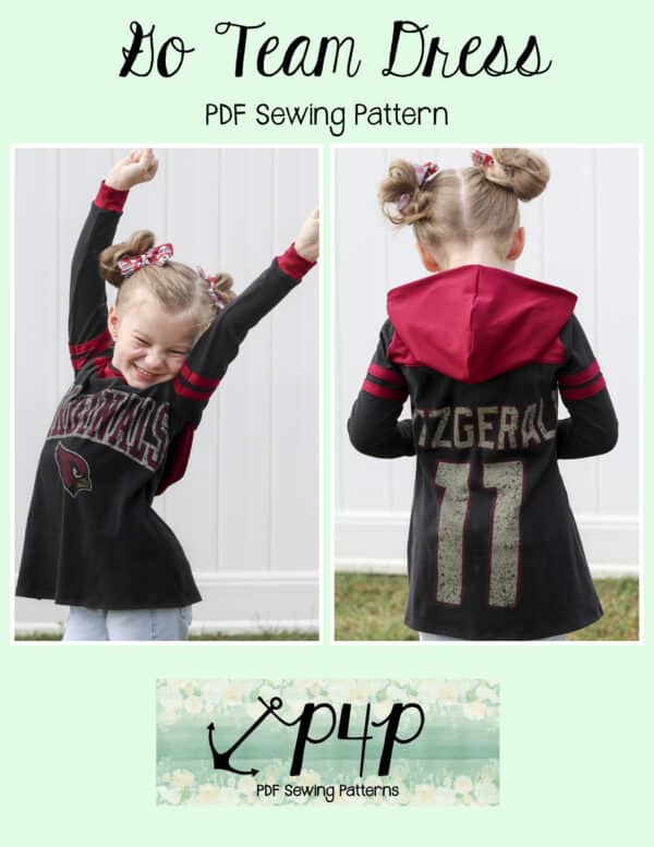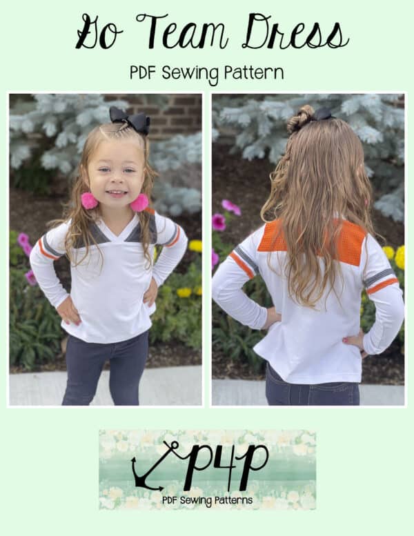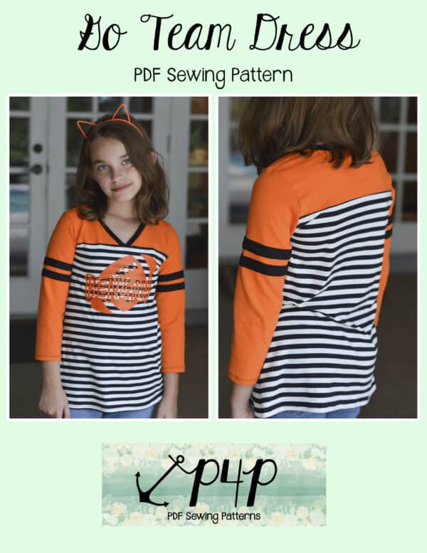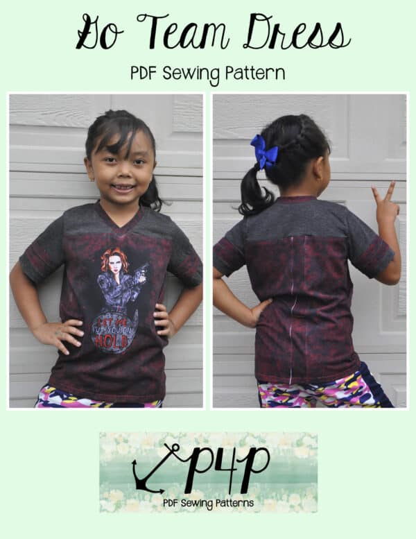 The Go Team Dress- Youth is the top or dress to help show your support for your favorite sport team, holiday, special event, favorite character, or anything else! A plain one makes a great sporty basic as well. You can pick from crew, V, or hood necklines. You are covered for all weather with short, 3/4, long hemmed or long with cuff sleeve options. The front and back yokes give a great opportunity for mixed fabrics, adding decorative stitching or more. Add on the sporty sleeve bindings for more fun details. The semi-fitted look is adorable and comfortable for any event. You can sew up a shirt, tunic, curved hem, or dress length to suit your fancy… or sew them all for different looks.