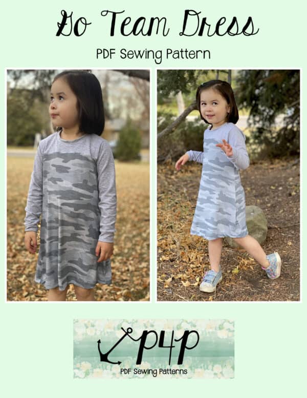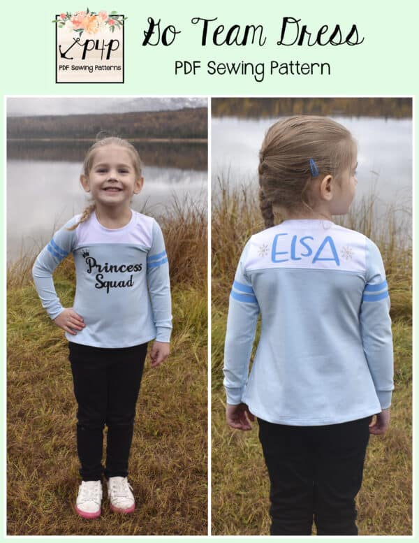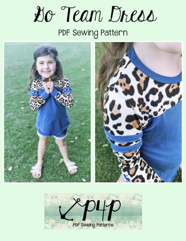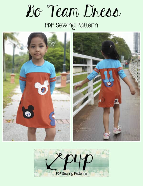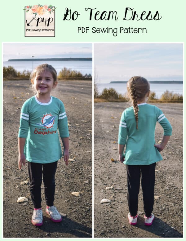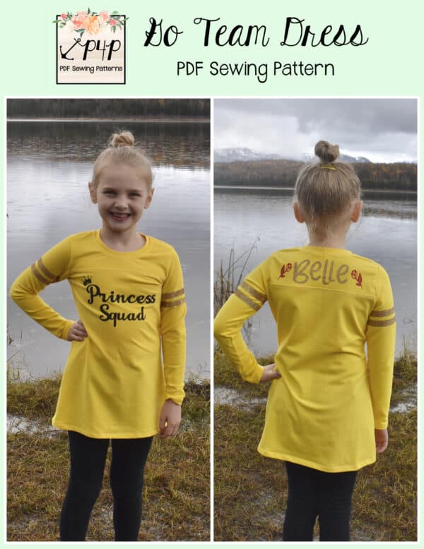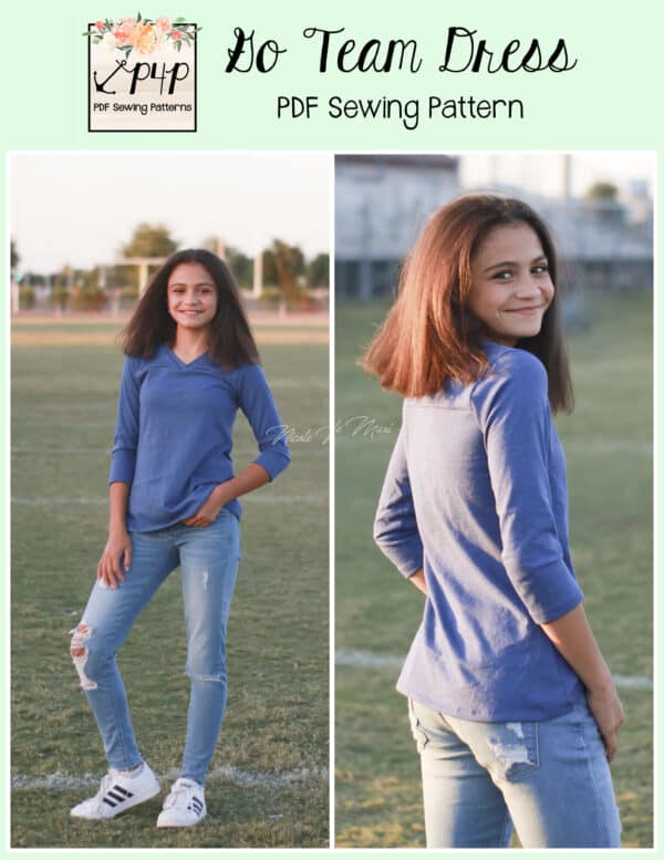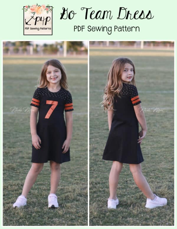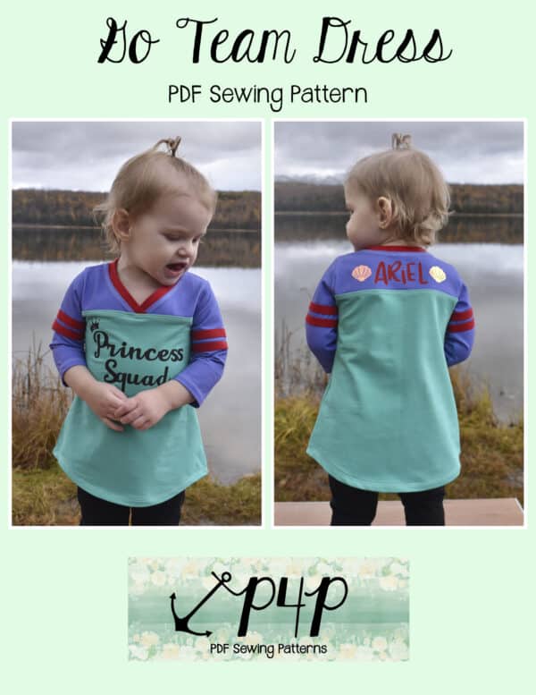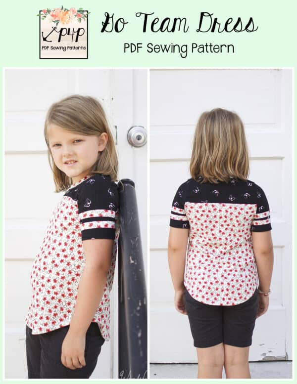 The Go Team Dress- Youth is the top or dress to help show your support for your favorite sport team, holiday, special event, favorite character, or anything else! A plain one makes a great sporty basic as well. You can pick from crew, V, or hood necklines. You are covered for all weather with short, 3/4, long hemmed or long with cuff sleeve options. The front and back yokes give a great opportunity for mixed fabrics, adding decorative stitching or more. Add on the sporty sleeve bindings for more fun details. The semi-fitted look is adorable and comfortable for any event. You can sew up a shirt, tunic, curved hem, or dress length to suit your fancy… or sew them all for different looks.
