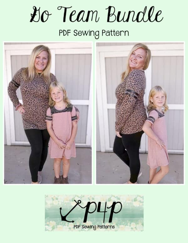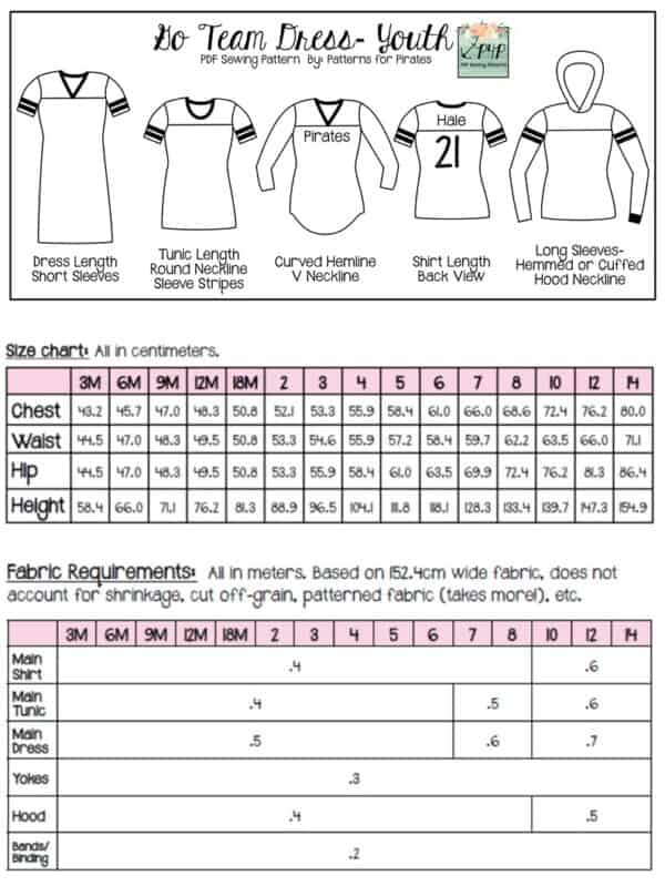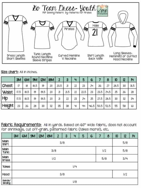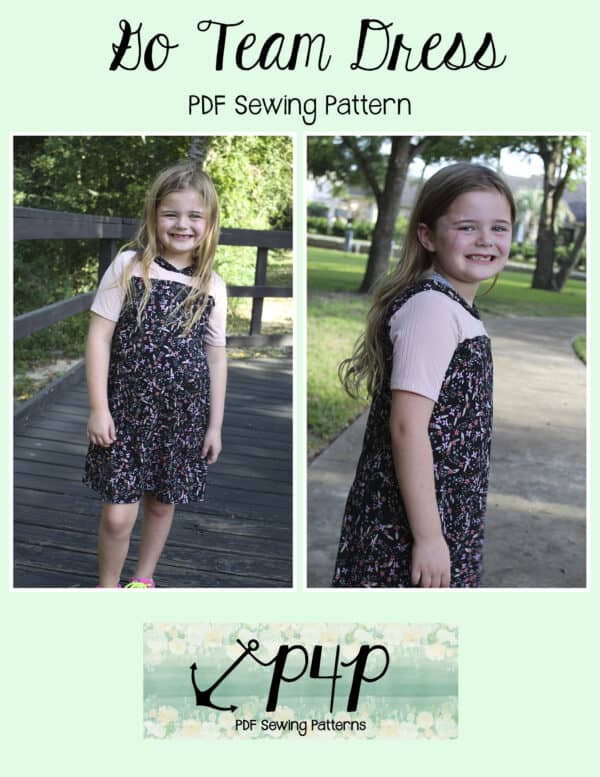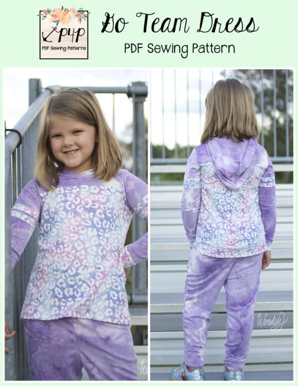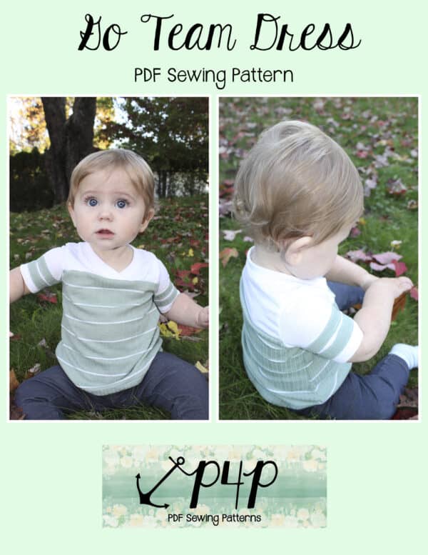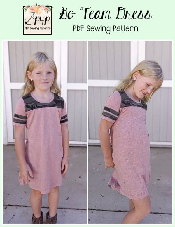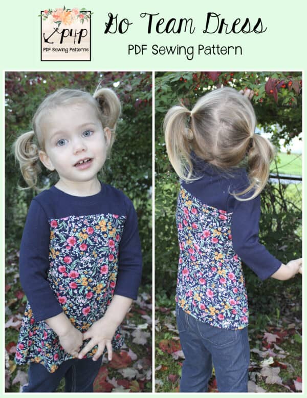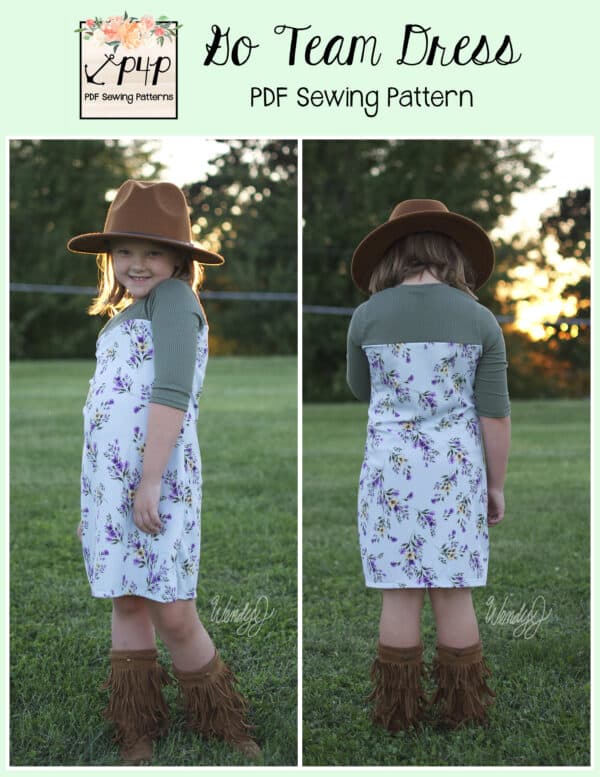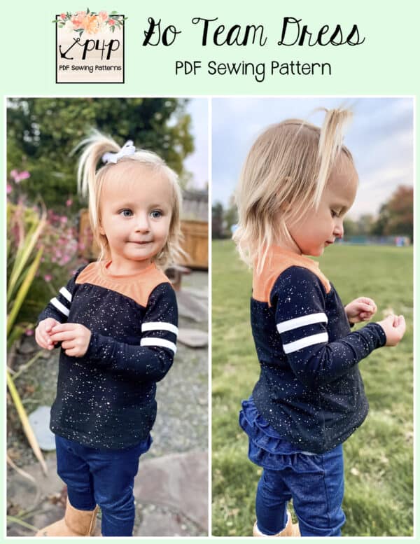 The Go Team Dress- Youth is the top or dress to help show your support for your favorite sport team, holiday, special event, favorite character, or anything else! A plain one makes a great sporty basic as well. You can pick from crew, V, or hood necklines. You are covered for all weather with short, 3/4, long hemmed or long with cuff sleeve options. The front and back yokes give a great opportunity for mixed fabrics, adding decorative stitching or more. Add on the sporty sleeve bindings for more fun details. The semi-fitted look is adorable and comfortable for any event. You can sew up a shirt, tunic, curved hem, or dress length to suit your fancy… or sew them all for different looks.