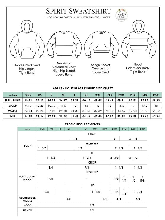 For the neckline, you can sew a standard neckband, a hood, or a hood with a neckband for a cut unique detail. You can also choose between a plain version or colorblocked body and sleeves, making it perfect for using multiple fabrics, school colors, team spirit wear, or fun scrap-busting combinations.