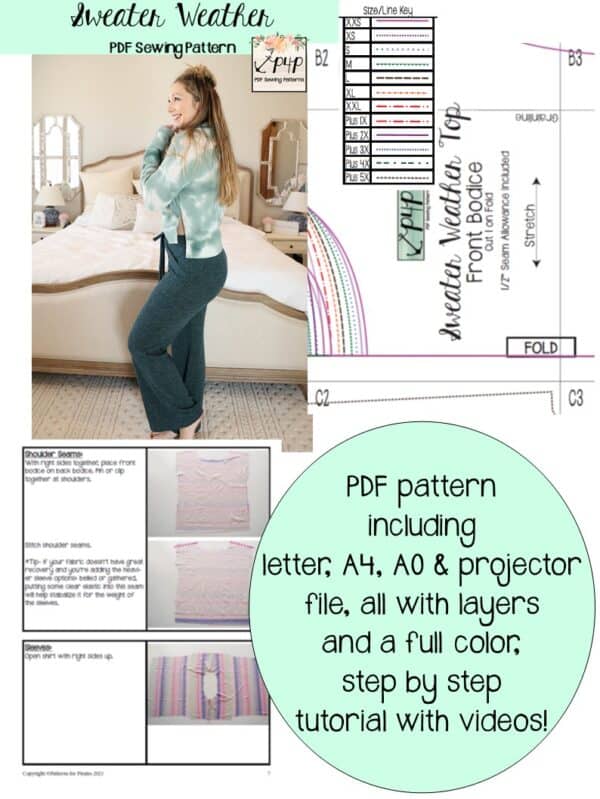 Sweater Weather is all the sweaters you crave when it’s chilly outside rolled into one pattern. You can choose from so many different options to create a vast amount of different looking final garments. You can take this top from lounge, running errands, a date, or to the office easily. The looser fit means you can use a huge variety of knit fabrics from thinner to thick and cozy. The construction is quick and easy with a few videos included to help beginners or if you just enjoy watching. The classic options in this pattern will stay a staple in your wardrobe for years to come and you can use on trend fabrics to hit the years look or use a classic fabric that will stay in style until it wears out.