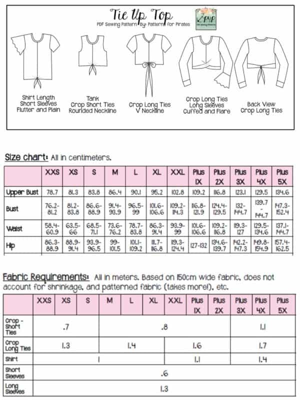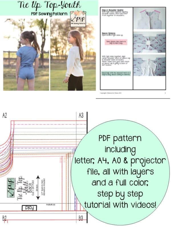 Worried about sewing up the ties on the Tie Up Top? Don’t be! We have a helpful video linked for that single step in the tutorial! We have several other video and blog links on other steps as well including neckband, v neckline, tank armbands, cuffs, easing in sleeves, etc.