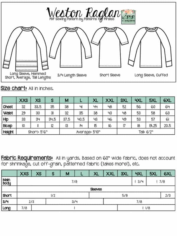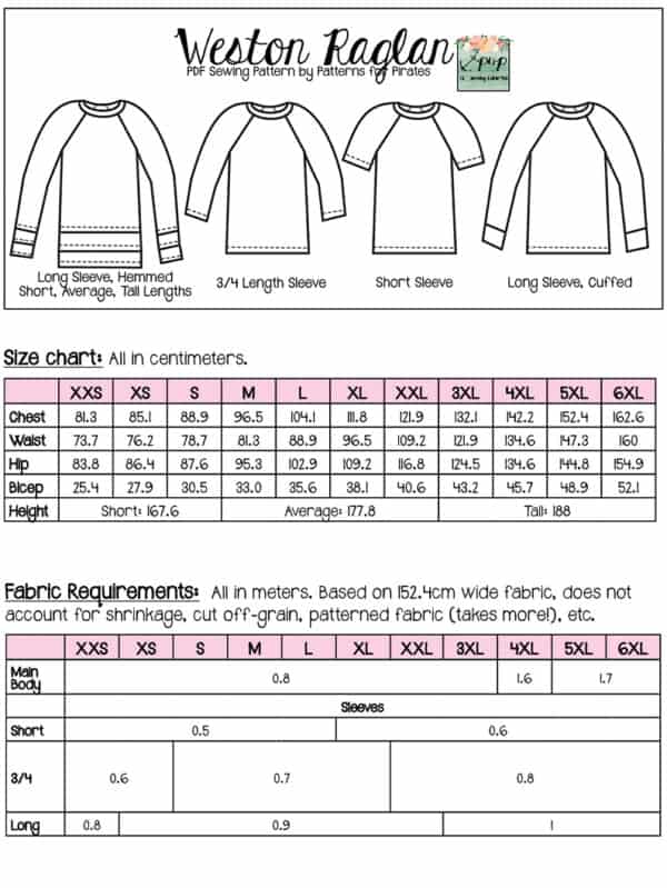 The Weston Raglan is drafted for t-shirt knits like tri-blend jerseys, ribbed knits, spun poly jersey, modal/rayon/bamboo knit, double brushed poly, lightweight cotton spandex, sweater knit, waffle knit, and the like. Want to use something thicker (think custom cotton spandex or french terry), you’ll need to size up to keep the same look and feel.
